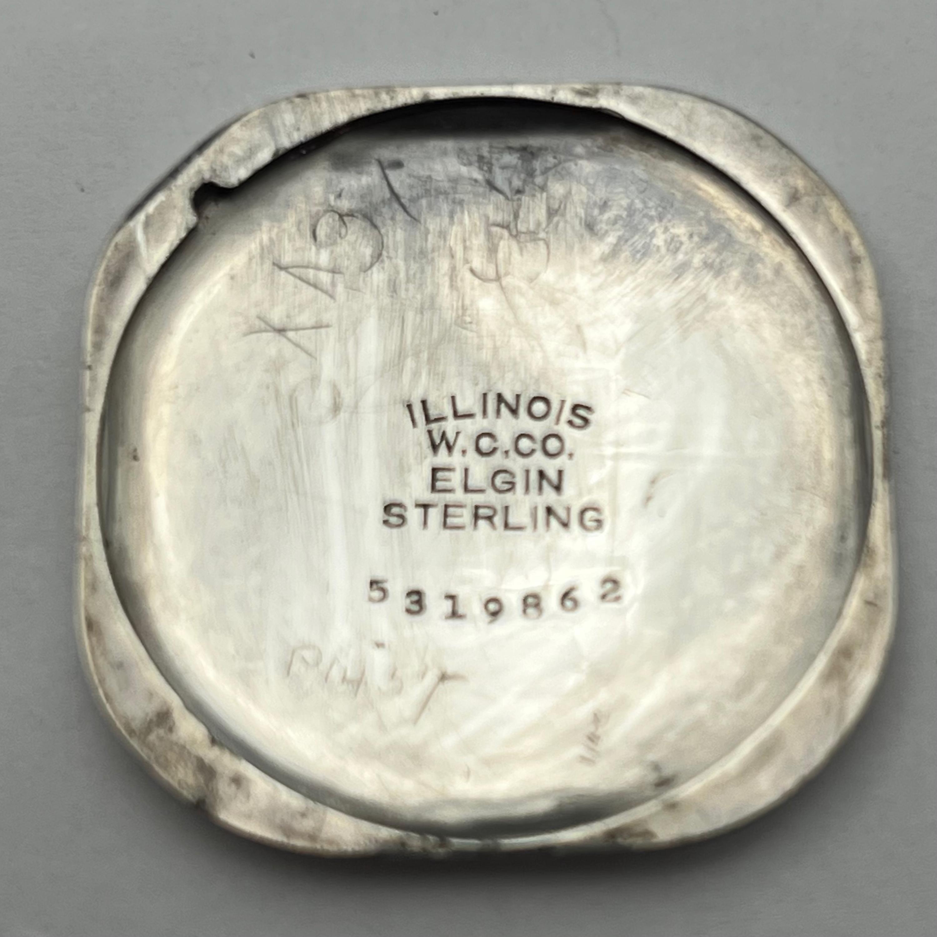 A sterling case from the Elgin supply chain is significantly rarer than typical gold-filled cases and is highly desirable among collectors.